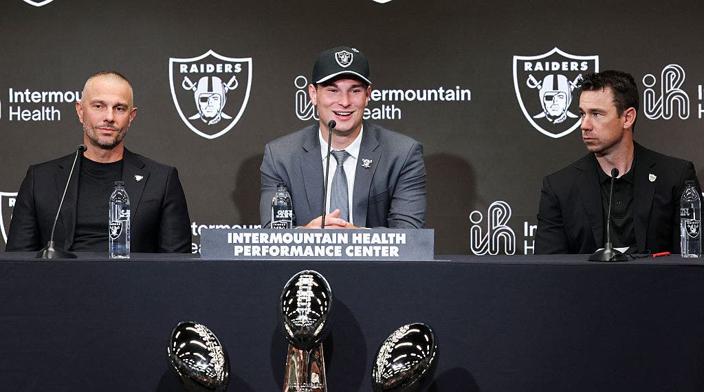 Fernando Mendoza speaks as Raiders general manager John Spytek (left) and head coach Klint Kubiak (right) look on during a news conference at team headquarters. (Photo by Ethan Miller/Getty Images)