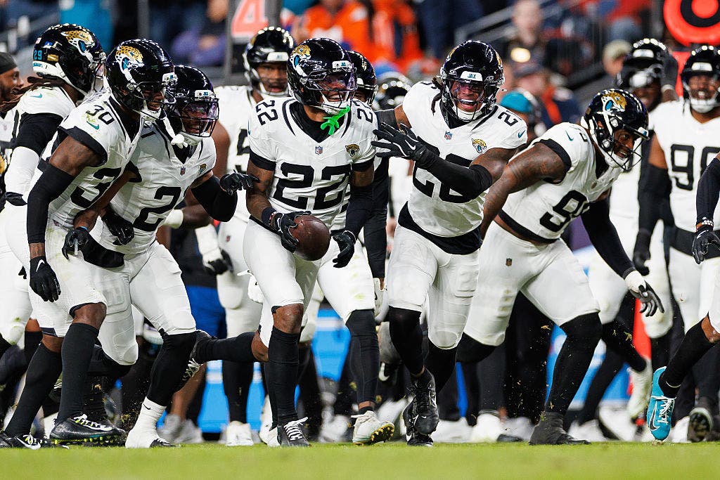 Jaguars cornerback Jarrian Jones celebrates with teammates after his interception in the fourth quarter against the Broncos on Sunday. (Photo by Brooke Sutton/Getty Images)