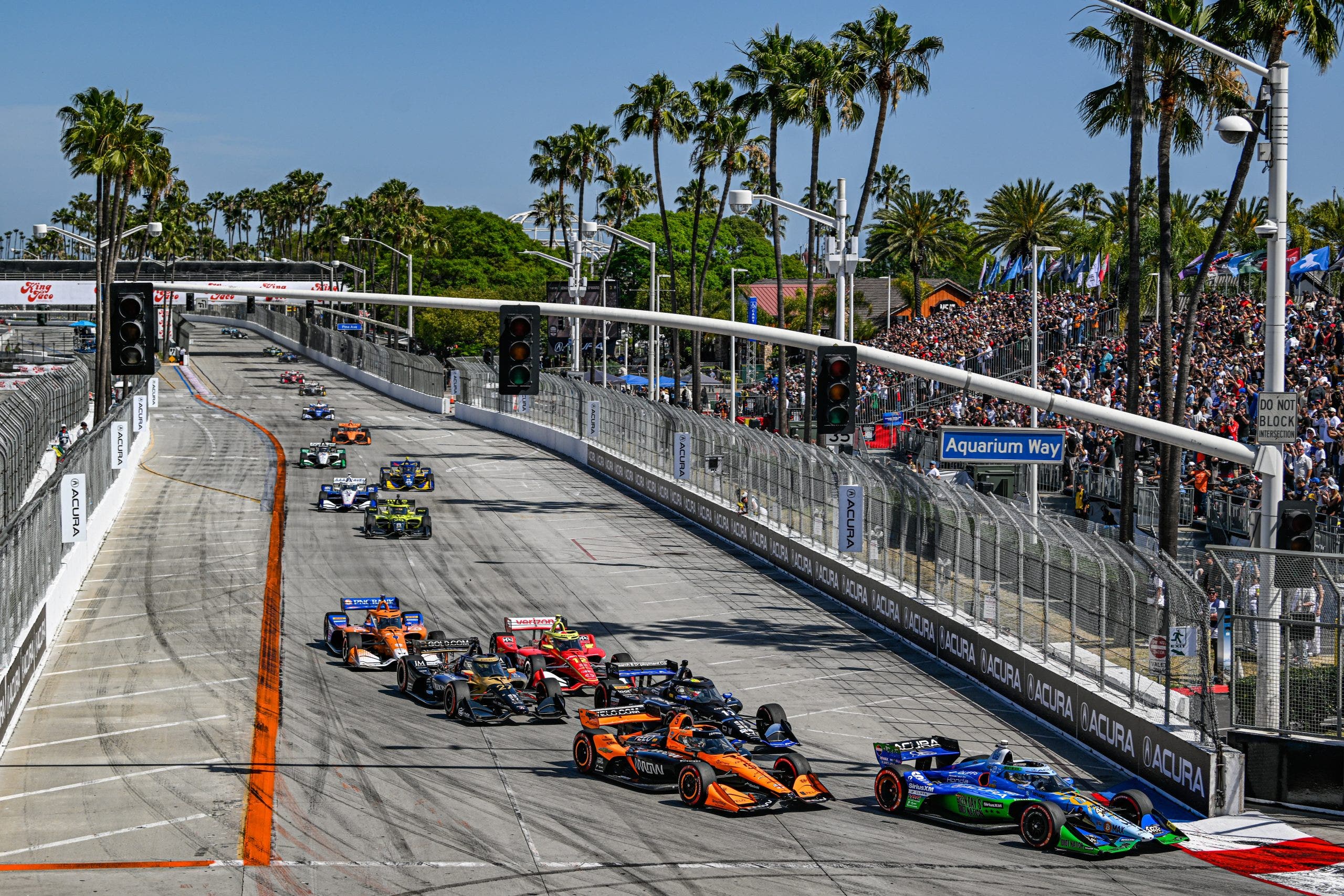 Felix Rosenqvist leads the start of the 2026 Grand Prix Of Long Beach. (Photo by Brandon Badraoui/Lumen via Getty Images)