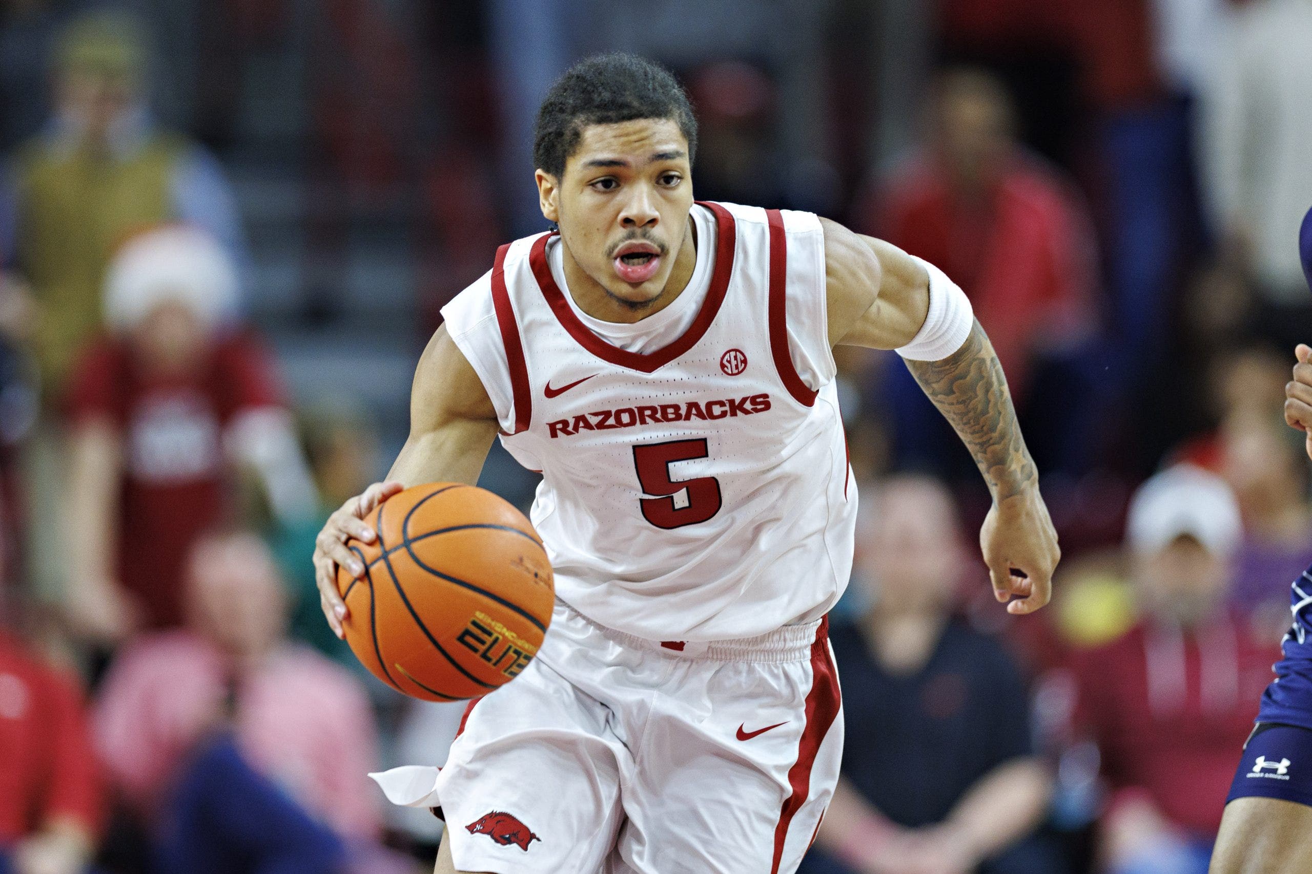 FAYETTEVILLE, ARKANSAS: Darius Acuff Jr. #5 of the Arkansas Razorbacks drives to the basket during a game against the Queens Royals at Bud Walton Arena on December 16, 2025. The Razorbacks defeated the Royals 108-80. (Photo by Wesley Hitt/Getty Images)