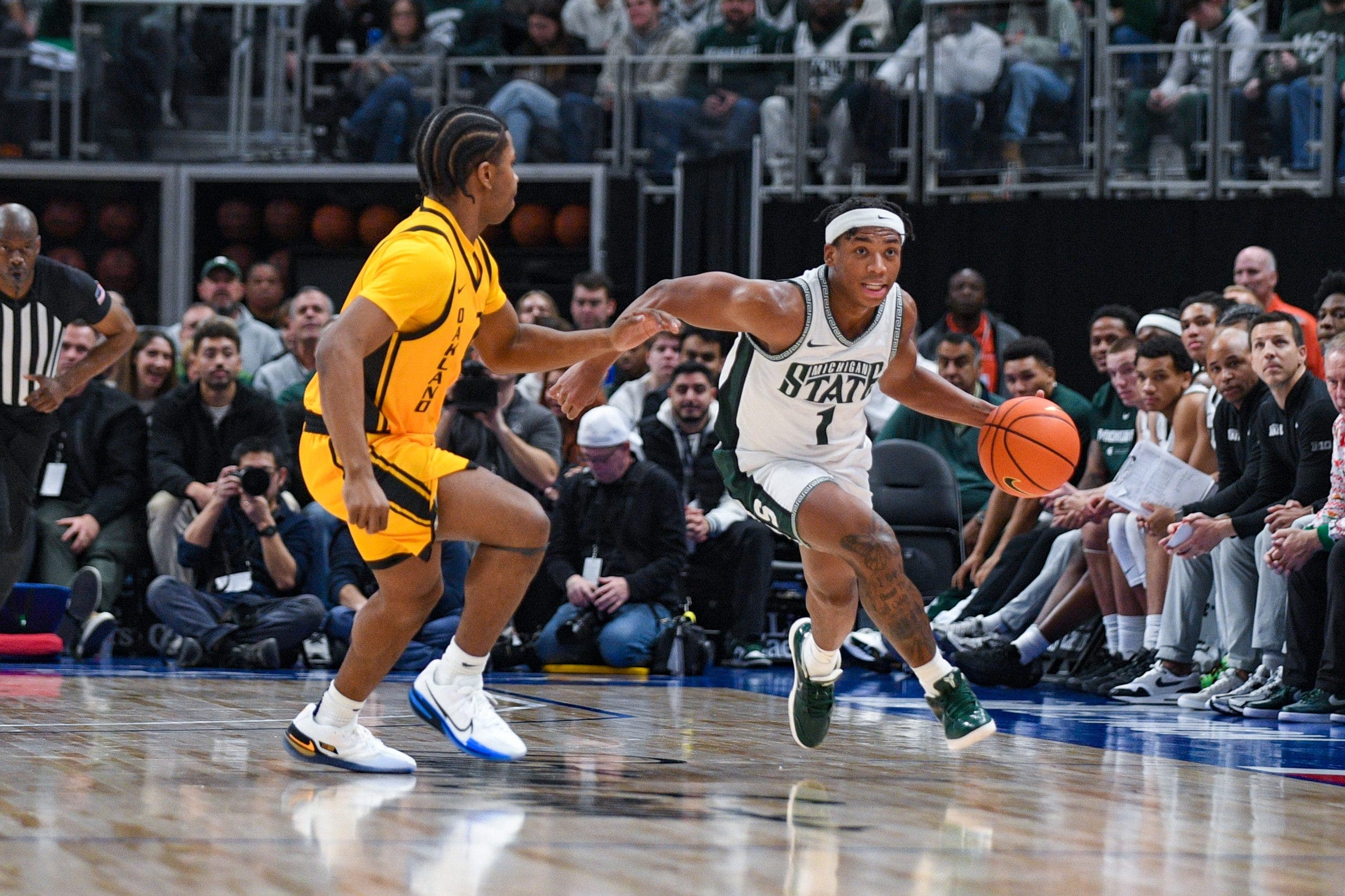 DETROIT, MICHIGAN: Jeremy Fears Jr. #1 of the Michigan State Spartans dribbles the ball against Khoi Thurmon #21 of the Oakland Golden Grizzlies during the first half of a college basketball game at Little Caesars Arena on December 20, 2025. The Michigan State Spartans won the game 79-70. (Photo by Aaron J. Thornton/Getty Images)