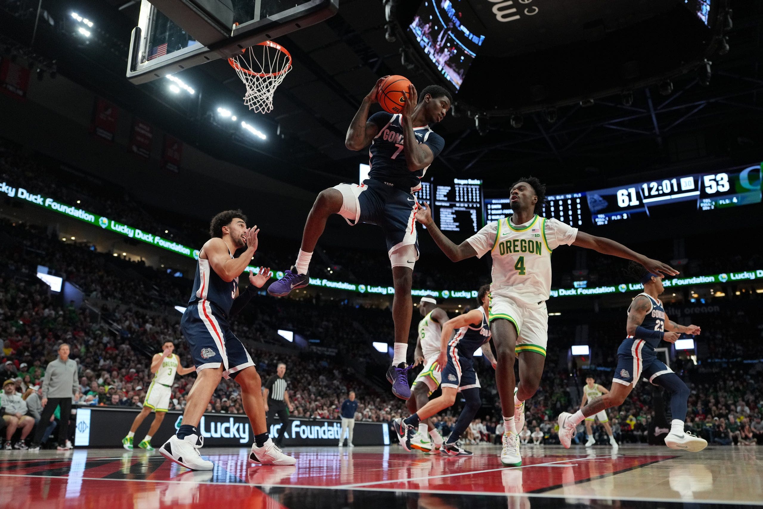 PORTLAND, OREGON: Tyon Grant-Foster #7 of the Gonzaga Bulldogs grabs a rebound against Dezdrick Lindsay #4 of the Oregon Ducks during the second half at Moda Center on December 21, 2025. (Photo by Soobum Im/Getty Images)