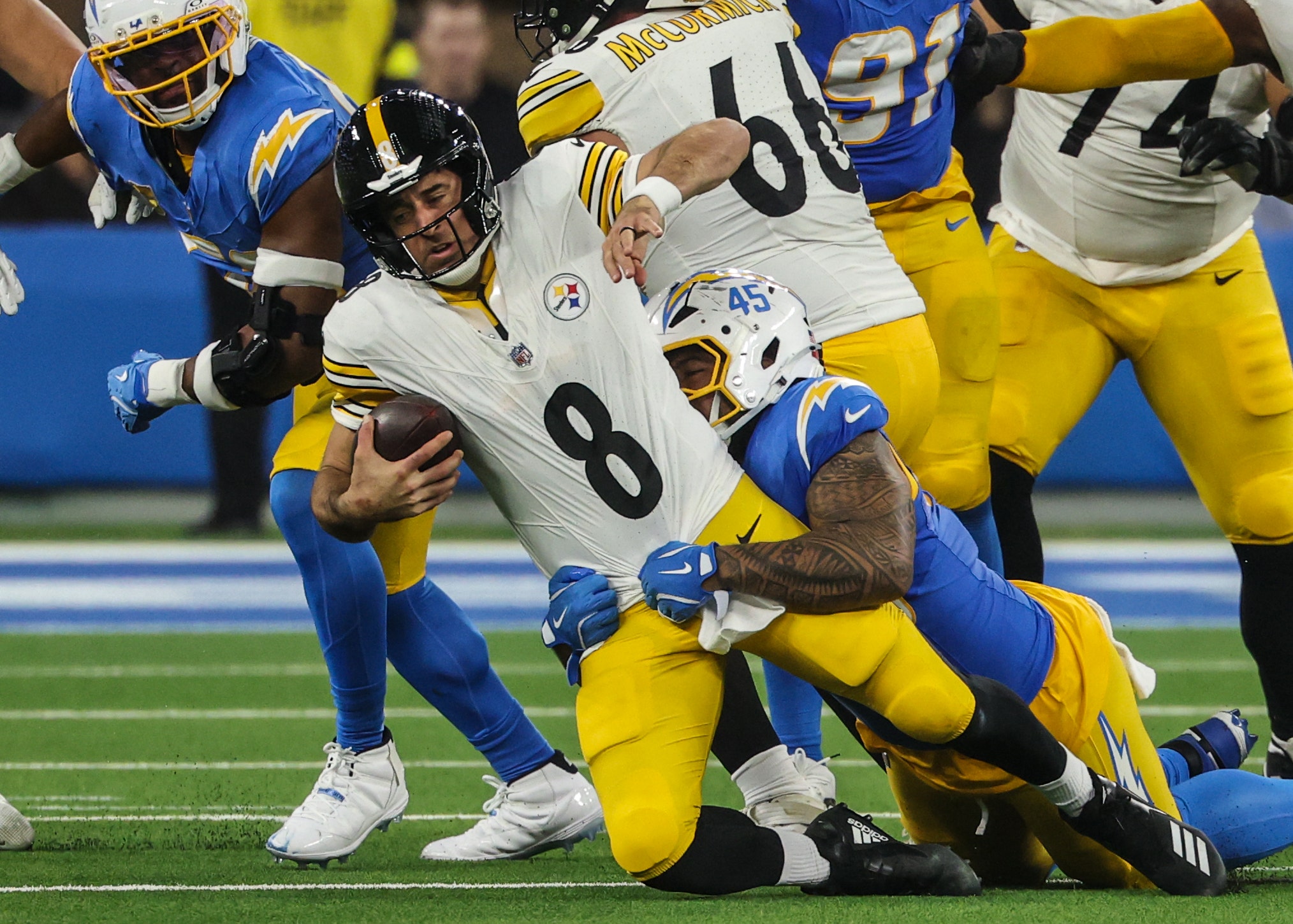 Chargers defensive coordinator Jesse Minter had his defense dialed in from the start, plastering Pittsburgh receivers and cutting off lanes for Rodgers to escape once pressured. The Chargers pressured Rodgers on just eight of his 34 dropbacks, according to Next Gen Stats. However, Rodgers did not complete a pass under pressure, finishing 0 of 5 and taking three sacks, including a safety by Chargers edge rusher Khalil Mack.