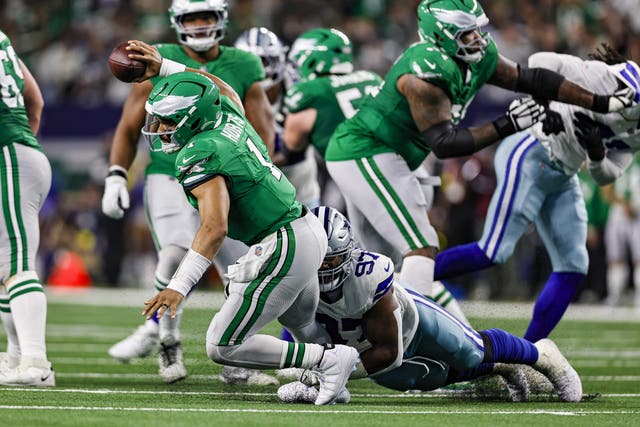 OK, I’ll take a first swing at creating chaos. There’s no one person to blame for the Eagles after their embarrassing loss to the Cowboys. It’s everyone. That’s probably what will make this loss sting so much in Philly. The passing game was actually more productive than normal, as Jalen Hurts had 289 passing yards and one passing touchdown (with two more rushing touchdowns). Receiver A.J. Brown had eight catches for 110 yards and a touchdown (so he can’t complain).
